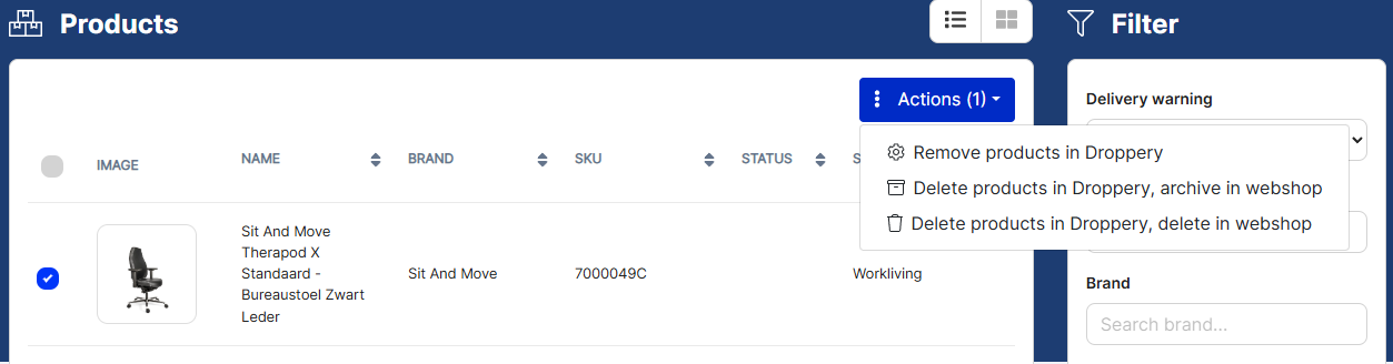 Delete products in Droppery, archive in webshop : You can do that if you want to disconnect the product but you want to keep the product sheet in your draft product