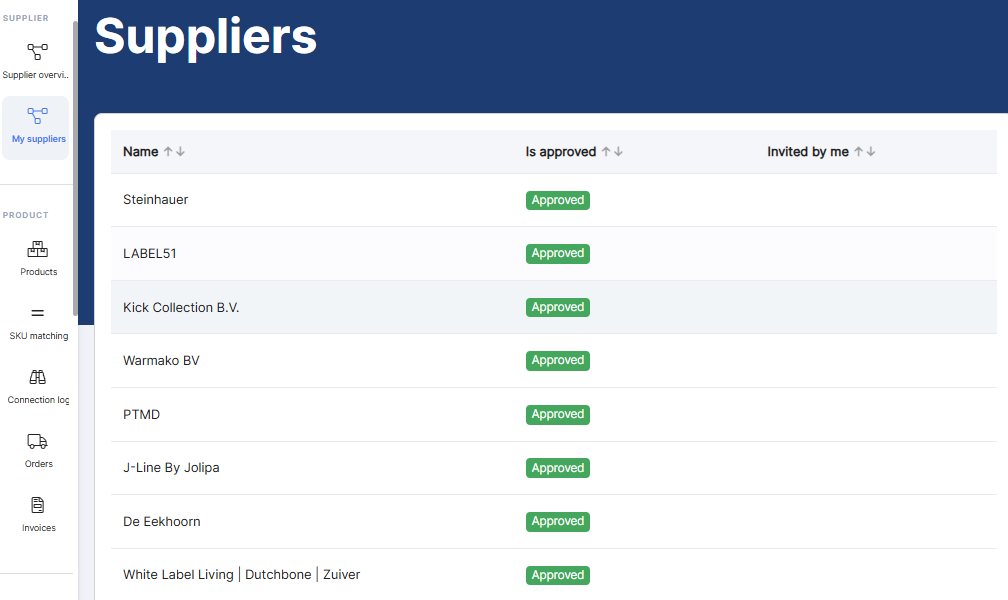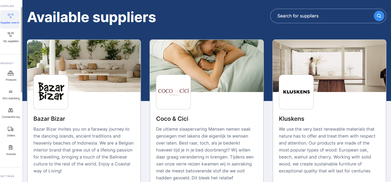The supplier overview is where you will find all the different suppliers present on the platform. You can apply filters by category of products you want to see, or enter the name of a supplier, if you have a specific one in mind.