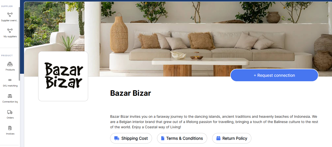 At the top right, you see the “Request Connection” button, which will send a request to the provider, giving them the opportunity to review your store and brand and then accept or decline the connection.
