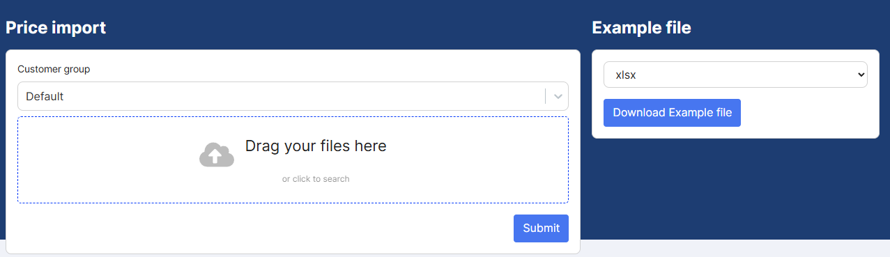 This page allows you to simultaneously update the prices of a large number of products previously posted online. You can select which customer groups these price changes should be applied to. The file must contain the columns 'sku', 'is_visible', 'retail_price_incl' and 'supplier_price_excl'. Again, a template can be selected and downloaded on the right side of the page.