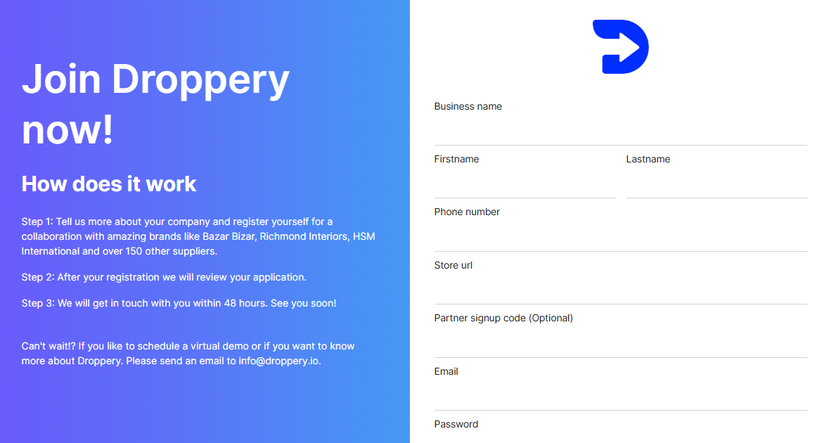 To register you can follow the following link : https://platform.droppery.io/register/webshop